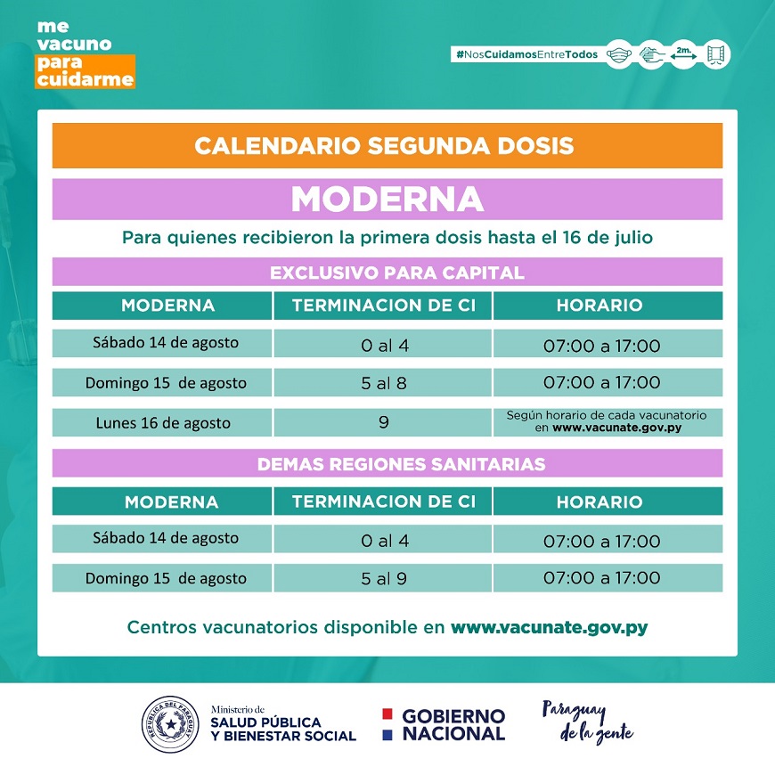 El Plan Nacional de Vacunación contra COVID-19 avanza en la aplicación de segunda dosis. En este material, encontrará el calendario con terminación de cédula de identidad, para quienes recibieron primera dosis de AstraZeneca hasta el 15 de junio, y Moderna, para quienes recibieron primera dosis hasta el 16 de julio, tanto para Asunción o Capital, como para los departamentos del país. Los vacunatorios COVID-19 estarán habilitados de 7:00 a 17:00, este sábado y domingo.
