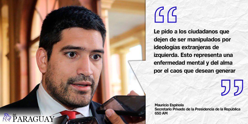 Mauricio Espínola, secretario privado de la Presidencia de la República, argumentó que los manifestantes están siendo manipulados por ideologías de izquierda y por extranjeros que solo buscan instalar el caos en nuestro país.