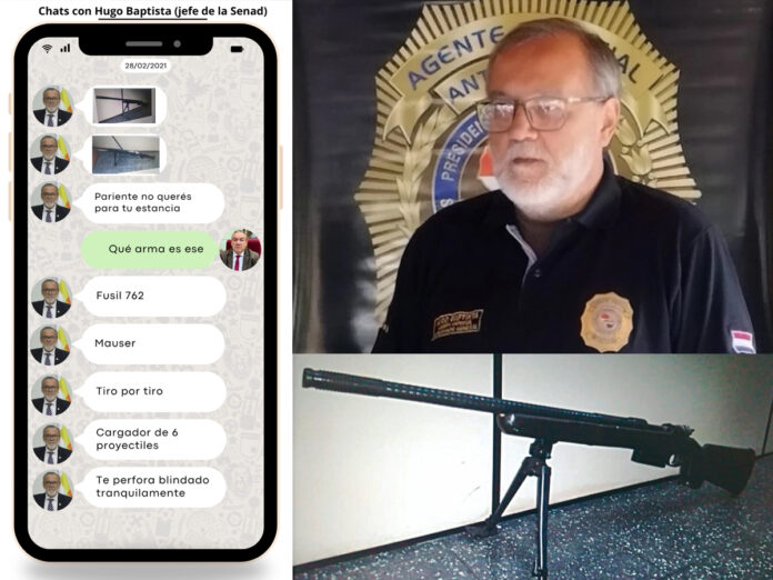 Hugo Derlis Baptista Báez, director general de la Secretaría Antidrogas (Senad), ofreció un potente fusil Mauser 7.62 mm al fallecido diputado Eulalio “Lalo” Gomes. El arma, de uso exclusivo de fuerzas de seguridad estatales, es altamente efectiva y ha sido utilizada en grandes conflictos bélicos.