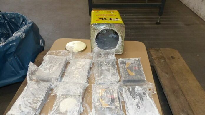 Detrás de las latas de alimentos se escondía un cargamento de otras tantas llenas con otra sustancia. Después de descargar, los agentes de aduanas incautaron ocho paquetes de cocaína que pesaban más de 9 kg.