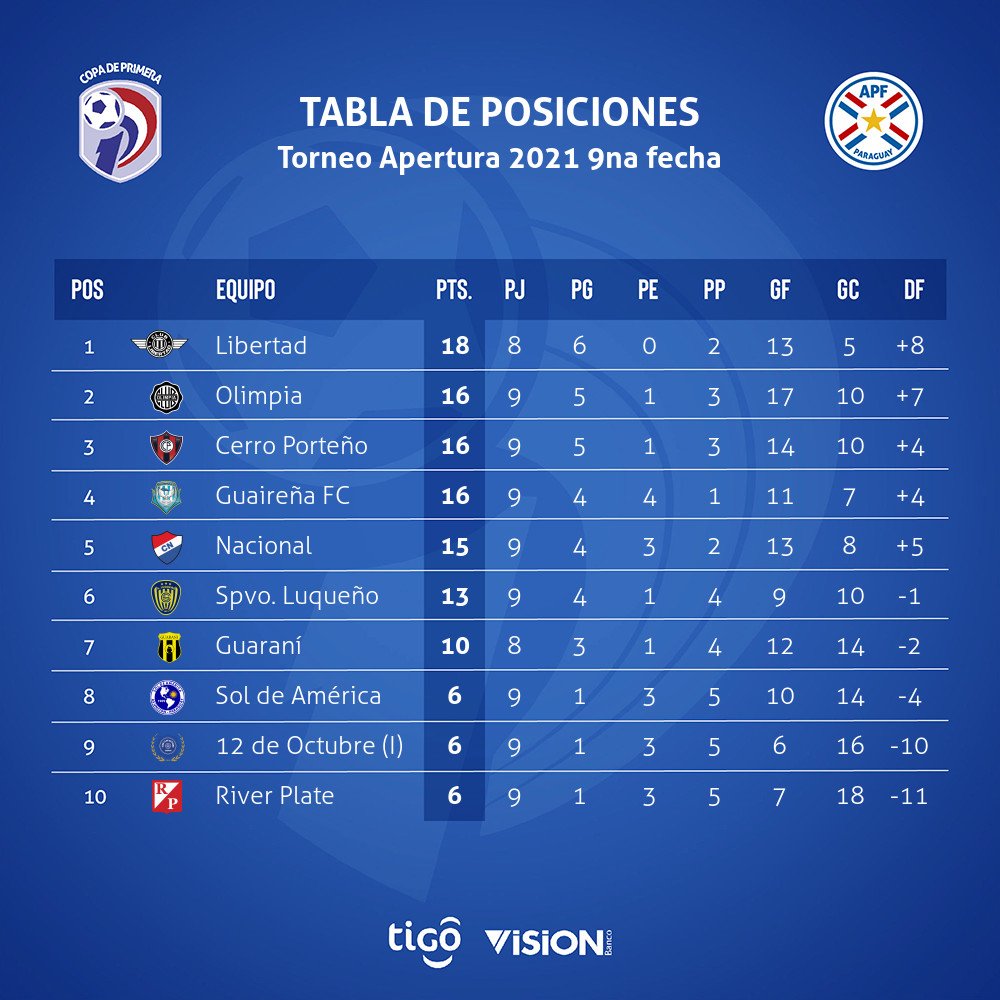 Tras la disputa de la novena fecha, la última de la primera rueda del Torneo Apertura, la tabla de posiciones muestra a Libertad como líder solitario, pero a solo 2 puntos de distancia de sus tres perseguidores; Olimpia, Cerro Porteño y Guaireña.