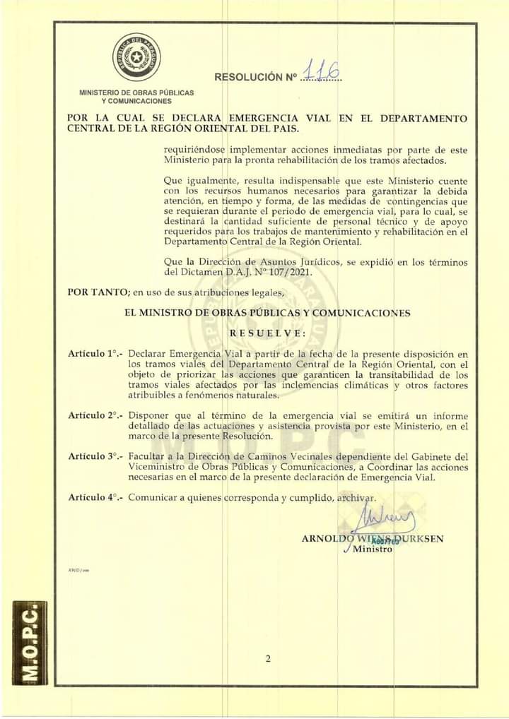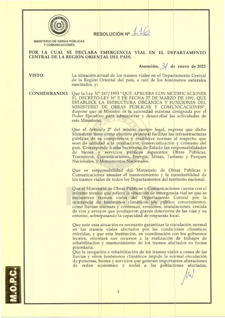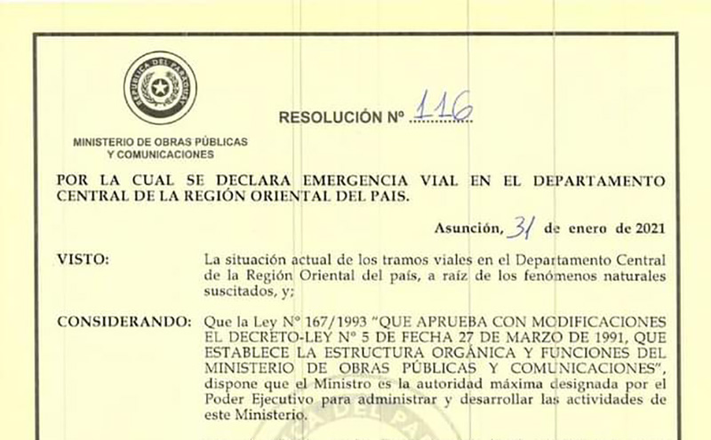 El ministro de Obras Públicas, Arnoldo Wiens, emitió en fecha 31 de enero de 2021 la Resolución N° 116/2021, por la cual se declara la Emergencia Vial en el Departamento Central, de la Región Oriental del país.