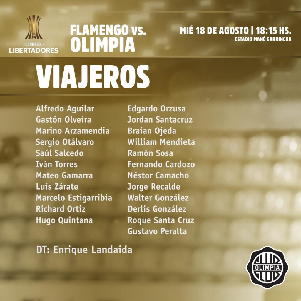 Olimpia viaja este martes con destino a Brasil, donde mañana, desde las 18.15 en el Estadio Nacional de Brasilia, se medirá al Flamengo en el juego de vuelta por los cuartos de final de la Copa Libertadores.