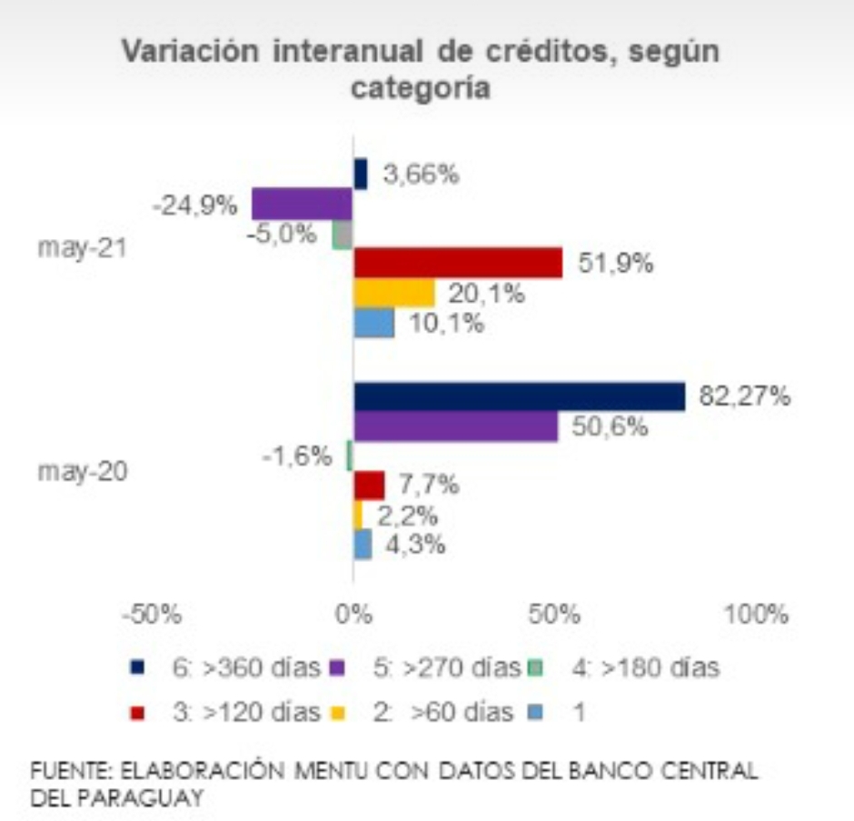 Por su parte, el análisis de los créditos clasificados por días de retraso muestra que con excepción de las categorías 4 y 5 (moras superiores a 180 y 270 días), todas las otras categorías han presentado incrementos interanuales, destacándose la categoría 3, correspondiente a las operaciones con retrasos de entre 120 y 180 días, que creció en más del 50%.