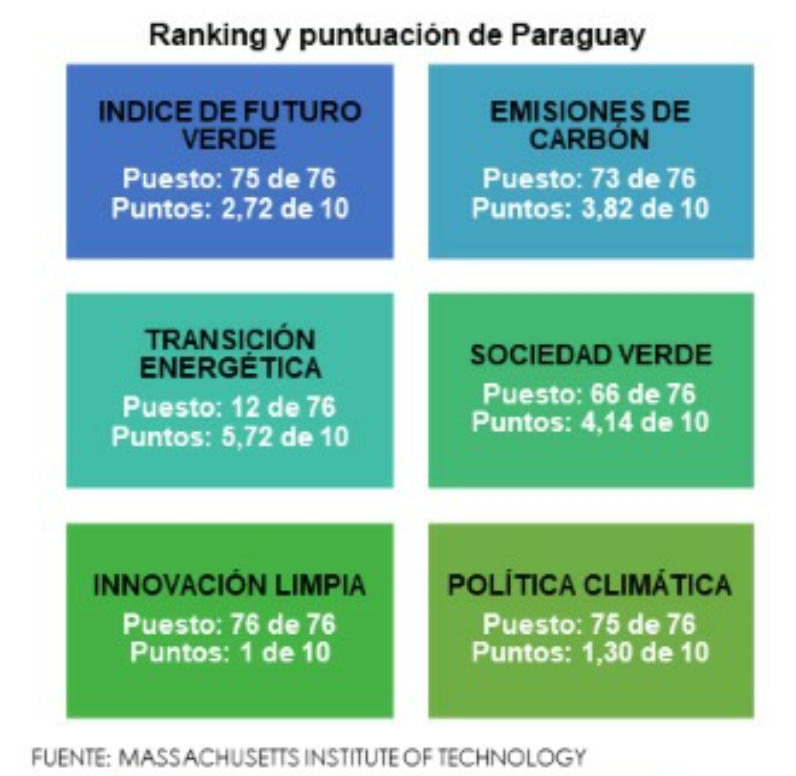 A modo de análisis de la realidad, la. Massachusetts Instituto of Tmhnology (MIT) publicó el índice de Futuro Verde, que evalúa el grado en que un grupo de 76 economías ejecuta acciones relacionadas con energía limpia mediante políticas de inversión e innovación sostenible. Paraguay ocupa el penúltimo puesto en el ranking con 2,72 puntos de 10 posibles, quedando rezagado por limitado progreso y compromiso con el desarrollo de una economía limpia e innovadora.