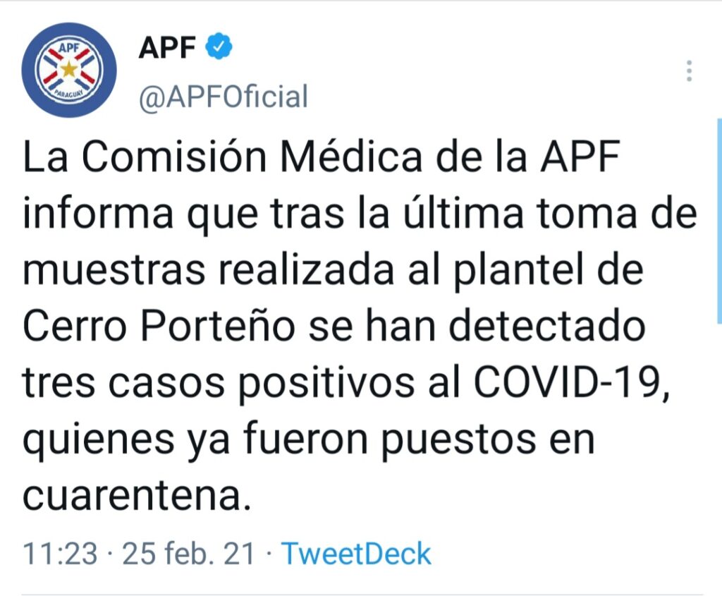 A los 7 casos confirmados dentro del plantel azulgrana, hoy la APF confirmó 3 nuevos casos positivos tras las tomas realizadas ayer por la tarde. Además, hay un caso indeterminado, el cual en las próximas horas se estaría confirmando o descartando.