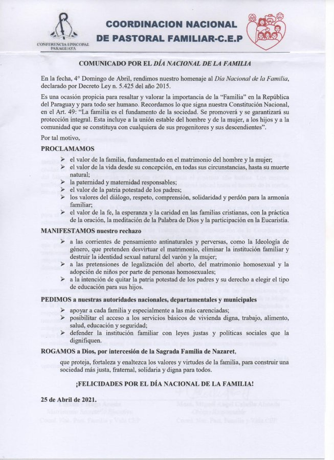 — Conferencia Episcopal Paraguaya (@ConferenciaEpi2) April 25, 2021